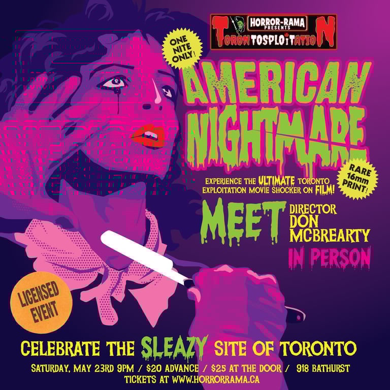 A special screening of a Toronto-shot exploitation classic: AMERICAN NIGHTMARE! Projected in glorious 16mm with special guest in attendance Director DON McBREARTY with between reel commentary!